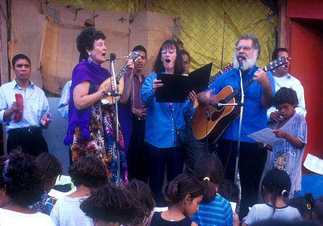 Holding the music book between Jean and Jim is Ann Hubbell, a member of St. Mark's UMC in Sacramento who accompanied the Strathdees.
