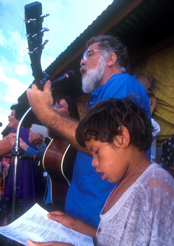 A boy living in a homeless shelter in Tegucigalpa sings along with Jim (with guitar).